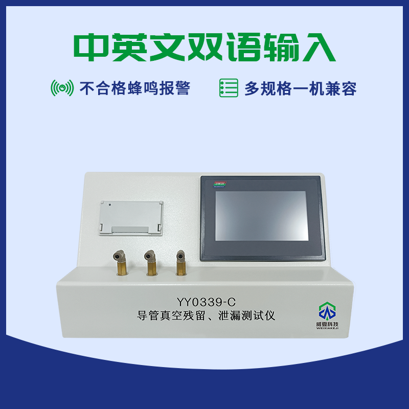 威夏科技YY0339-C導(dǎo)管真空殘留、泄漏測試儀是國家檢驗生產(chǎn)廠家產(chǎn)品性能的高效檢測設(shè)備,主要用于測定呼吸道用吸引導(dǎo)管的殘留真空和泄漏的物理特性,是鑒定呼吸道用吸引導(dǎo)管的重要手段之一。適用于輸液器、輸血器、輸液針、麻醉包過濾器、管路、導(dǎo)管、快速接頭等測試。設(shè)備由可編程控制器,觸摸屏、壓力傳感器、加壓抽壓裝置和機載打印機等組成。