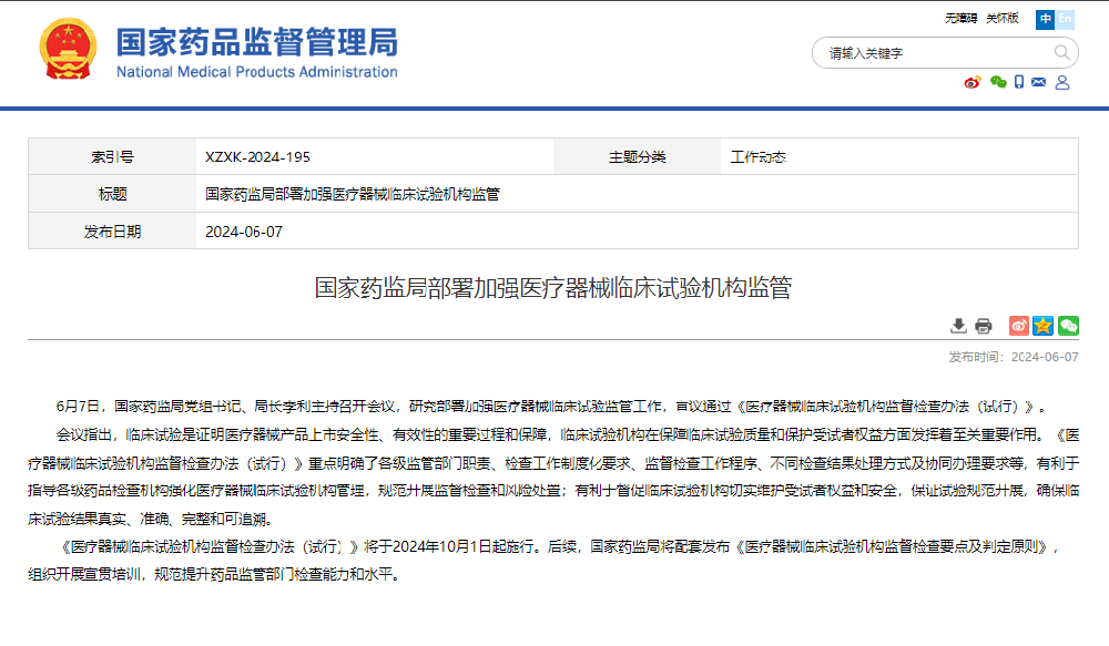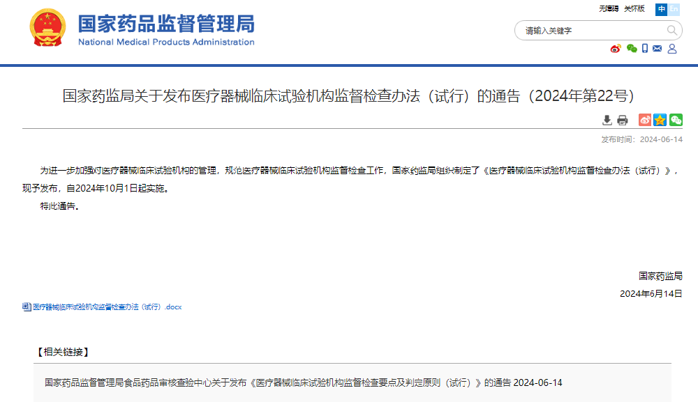 國家藥監(jiān)局關(guān)于發(fā)布醫(yī)療器械臨床試驗機構(gòu)監(jiān)督檢查辦法(試行)的通告(2024年第22號)