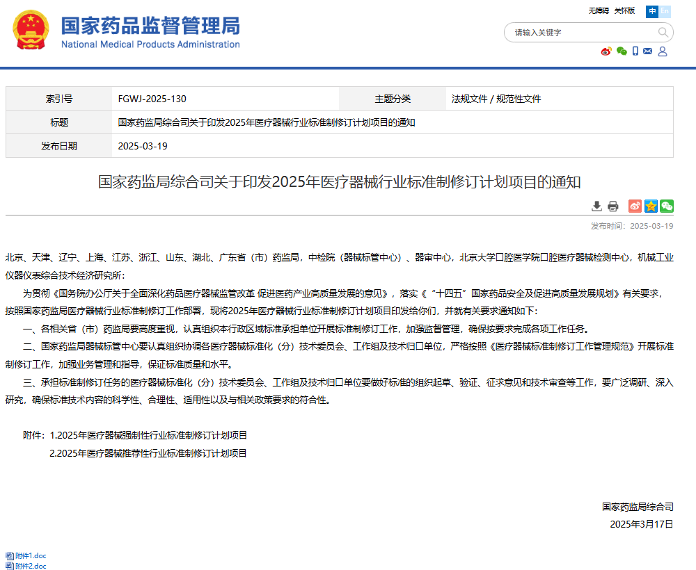 國家藥監(jiān)局綜合司關(guān)于印發(fā)2025年醫(yī)療器械行業(yè)標準制修訂計劃項目的通知